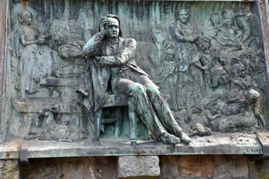 Lorsque l’on découvre cette plaque du sculpteur Barrias représentant Hugo au milieu de ses personnages, on serait presque reconnaissant aux autorités d’Occupation d’avoir montré un irrespect aussi crasse à l’égard de nos kitchteries nationales.