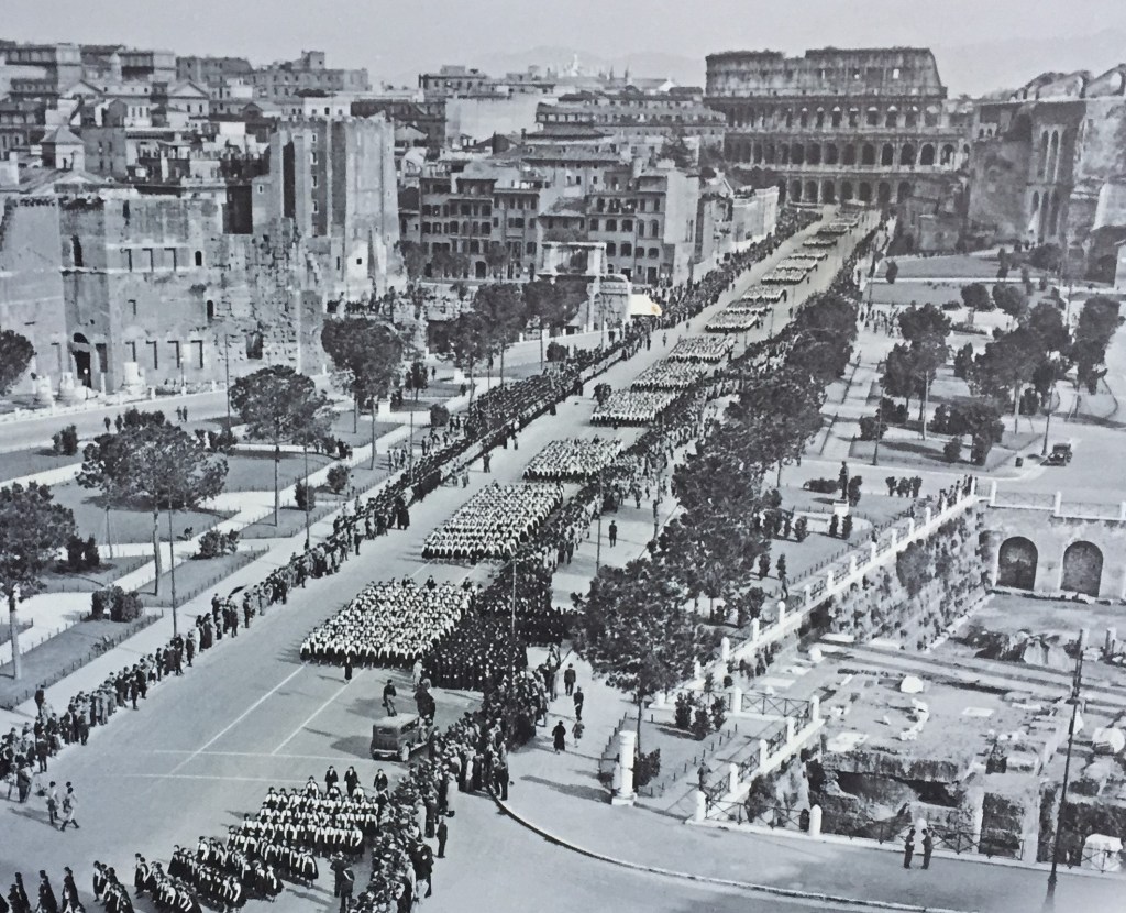 Dans les années 30, c’est l’Etat fasciste qui reprend les choses en main. On rase les ruelles environnantes et l’on trace la rectiligne Via dei Fori Imperiali, pour en faire le cadre des parades censées montrer les fascistes en dignes successeurs des légionnaires romains et Mussolini en Auguste (pas le clown, l’empereur).