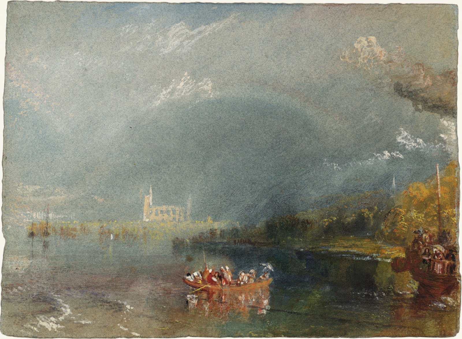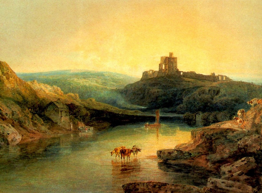 Pendant sa jeunesse, Turner n’a pas de chance : c’est la guerre contre la France, le blocus, le patriotisme (qui est une sorte de blocus mental). Un artiste britannique ne peut pas s’échapper en Europe, il est confiné devant les panoramas du territoire national, dont il est prié d’exalter les beautés. Le jeune artiste s’efforce consciencieusement de s’inscrire dans cette veine. Mais, même dans les vues patriotiques de sa jeunesse, je me dis qu’il y a déjà quelque chose, une façon de repousser le château illustre au fond du paysage pour mettre l’infini ou un simple troupeau de vaches au premier plan, qui transcende l’illustration et s’apparenterait déjà à une vision.
