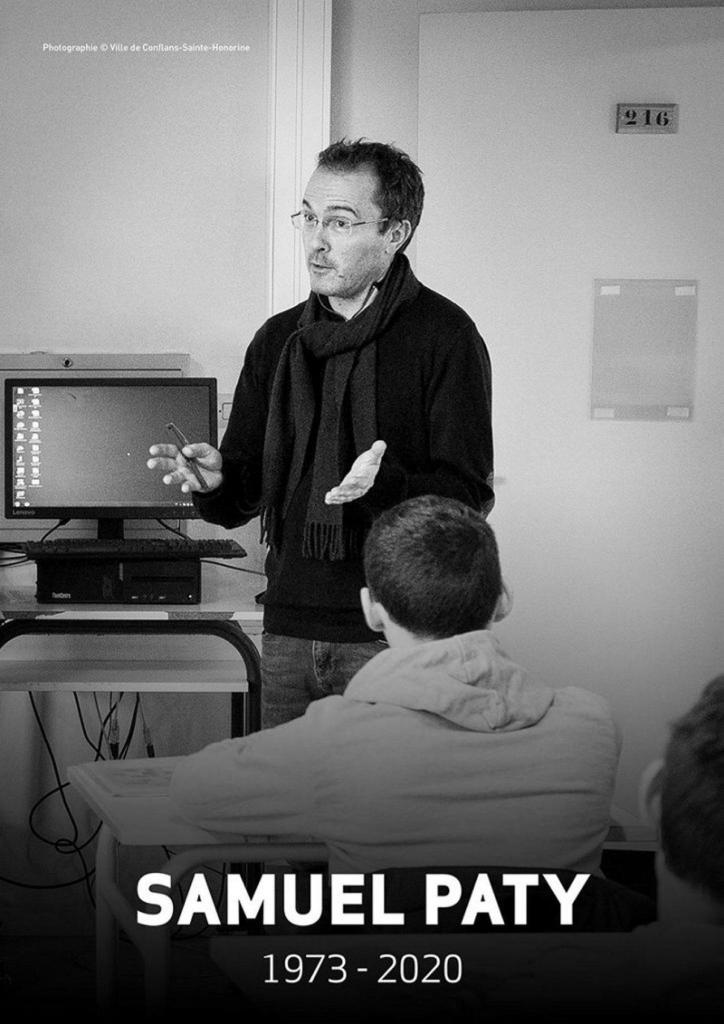 Il leur projette sur le tableau le portrait de Samuel Paty.