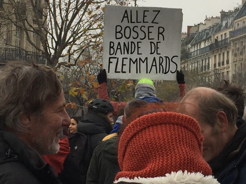 Evidemment, en ce jeudi 5 décembre 19, sur la place de la République, à Paris, le lot habituel de slogans et de trouvailles linguistiques. Mais, quand même, c’est une manif bizarre.
