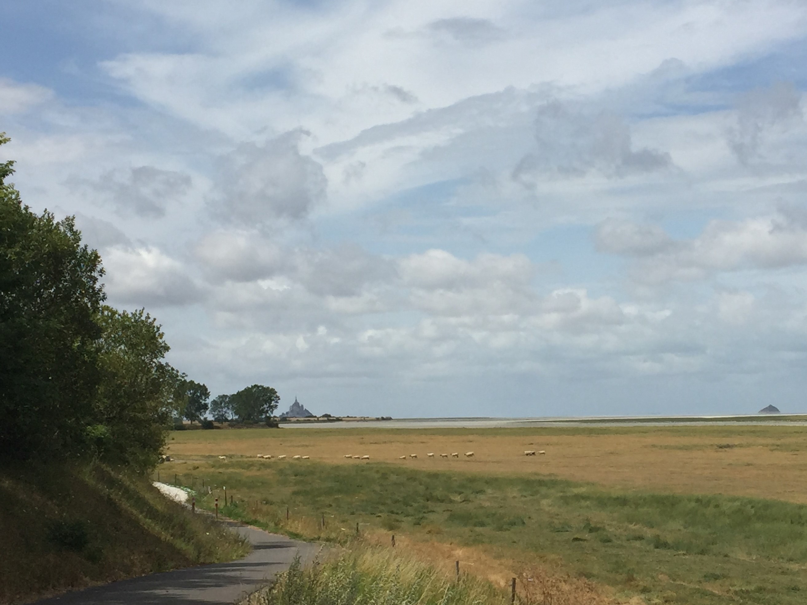 D’avoir effectué ces neuf jours de randonnée à travers la canicule, puis l’orage, avant de trouver la douceur, et de finir par une dernière journée venteuse d’orage en arrivant au Mont Saint-Michel, a rendu le périple plus sportif que prévu. Cela nous a obligés à nous adapter, à être attentifs à la météo, à raccourcir ou allonger nos étapes, guetter les coins d’ombre et les fontaines, surveiller les nuages, fréquenter aussi les piscines, réserver dans des hôtels ou des bungalows pour ne pas être mouillés, nous ménager une journée de repos incongrue et finalement salvatrice, prendre le train et même le car (à cinq vélos !), pour finalement atteindre notre but.